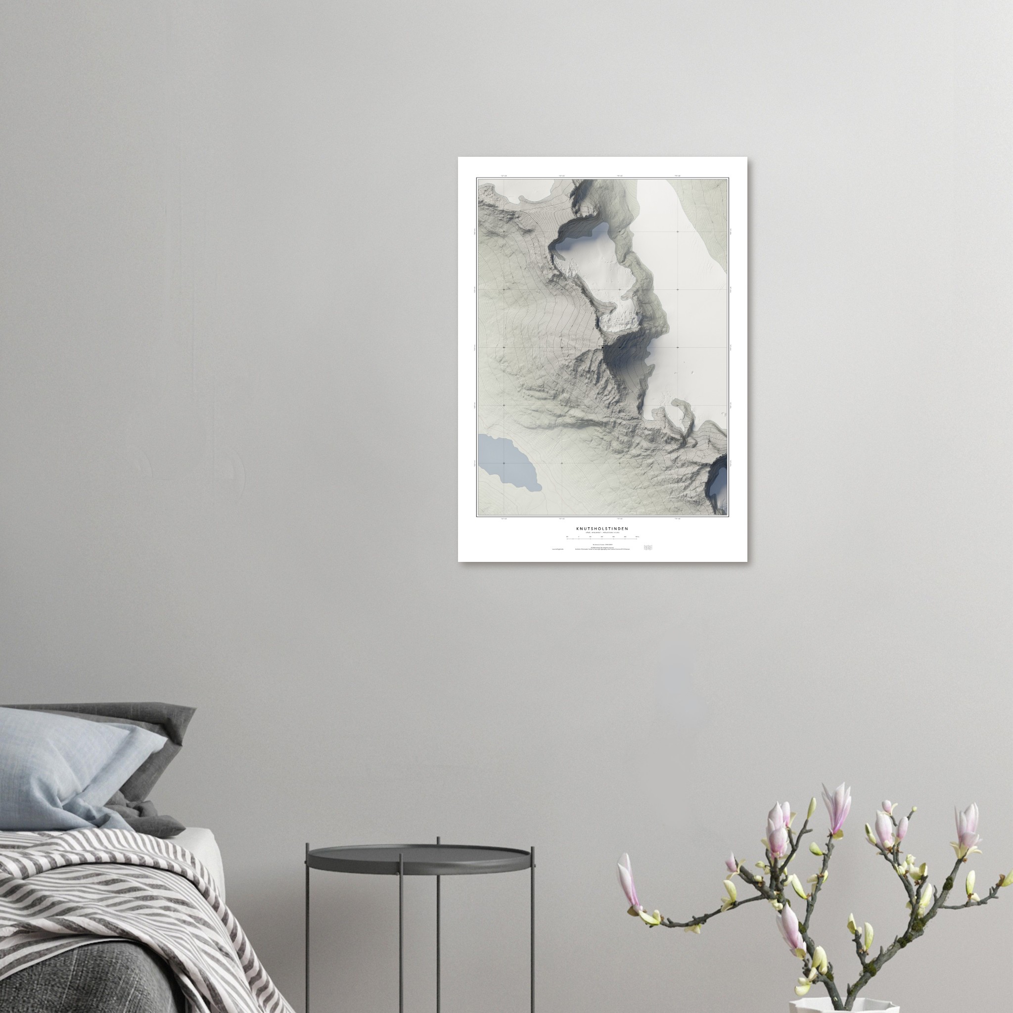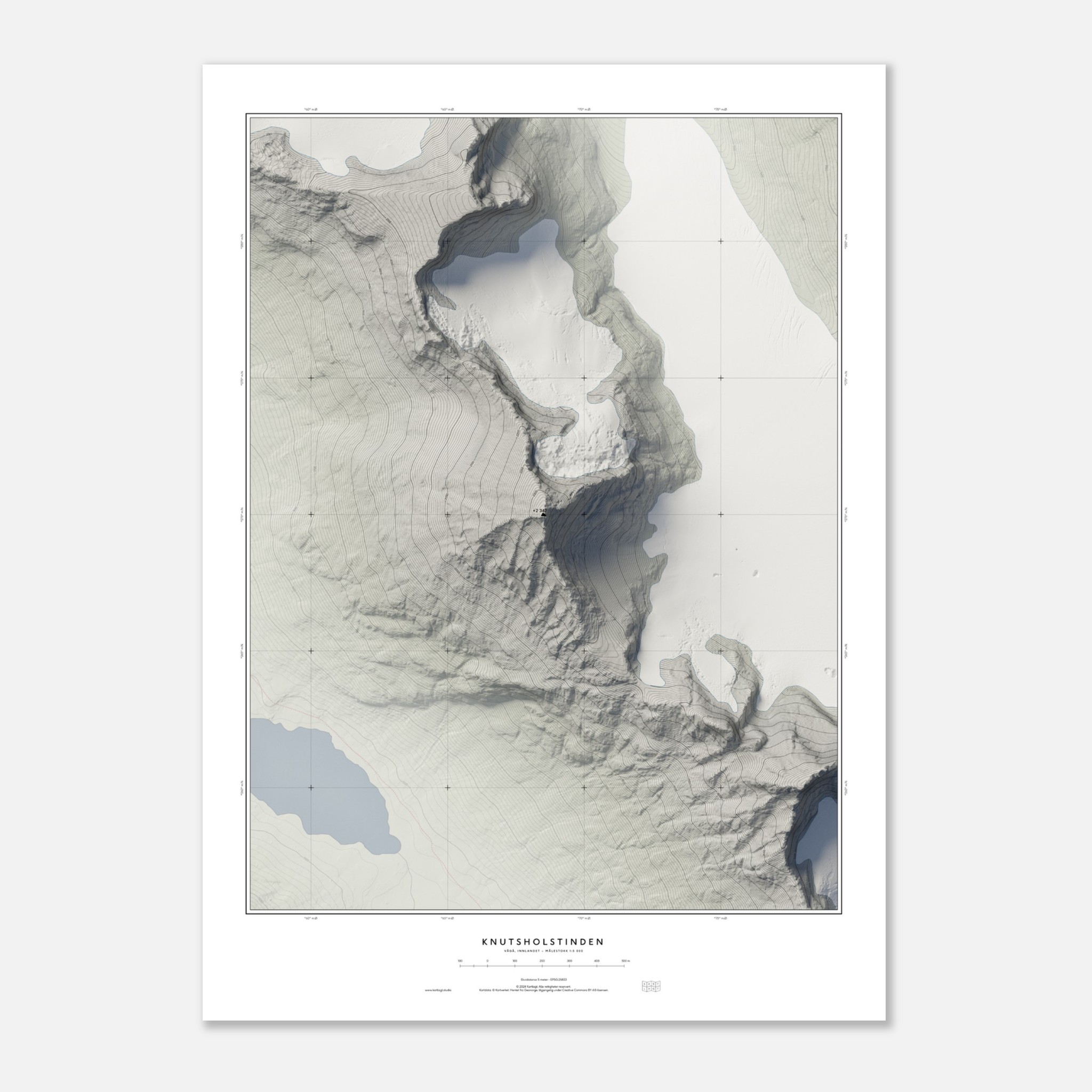 Med sin dramatiske profil på 2 342 meter over havet er Knutsholstinden kjent som en av Jotunheimens mest utfordrende topper. Fjellet, også kalt Store Knutsholstinden, ble lenge antatt å være Norges høyeste. Dette kartet fanger fjellets villhet og majestet, og gir en vakker og presis fremstilling av et av Norges mest imponerende fjell. Perfekt for naturelskere og fjellentusiaster som ønsker en unik dekorasjon inspirert av norsk natur.